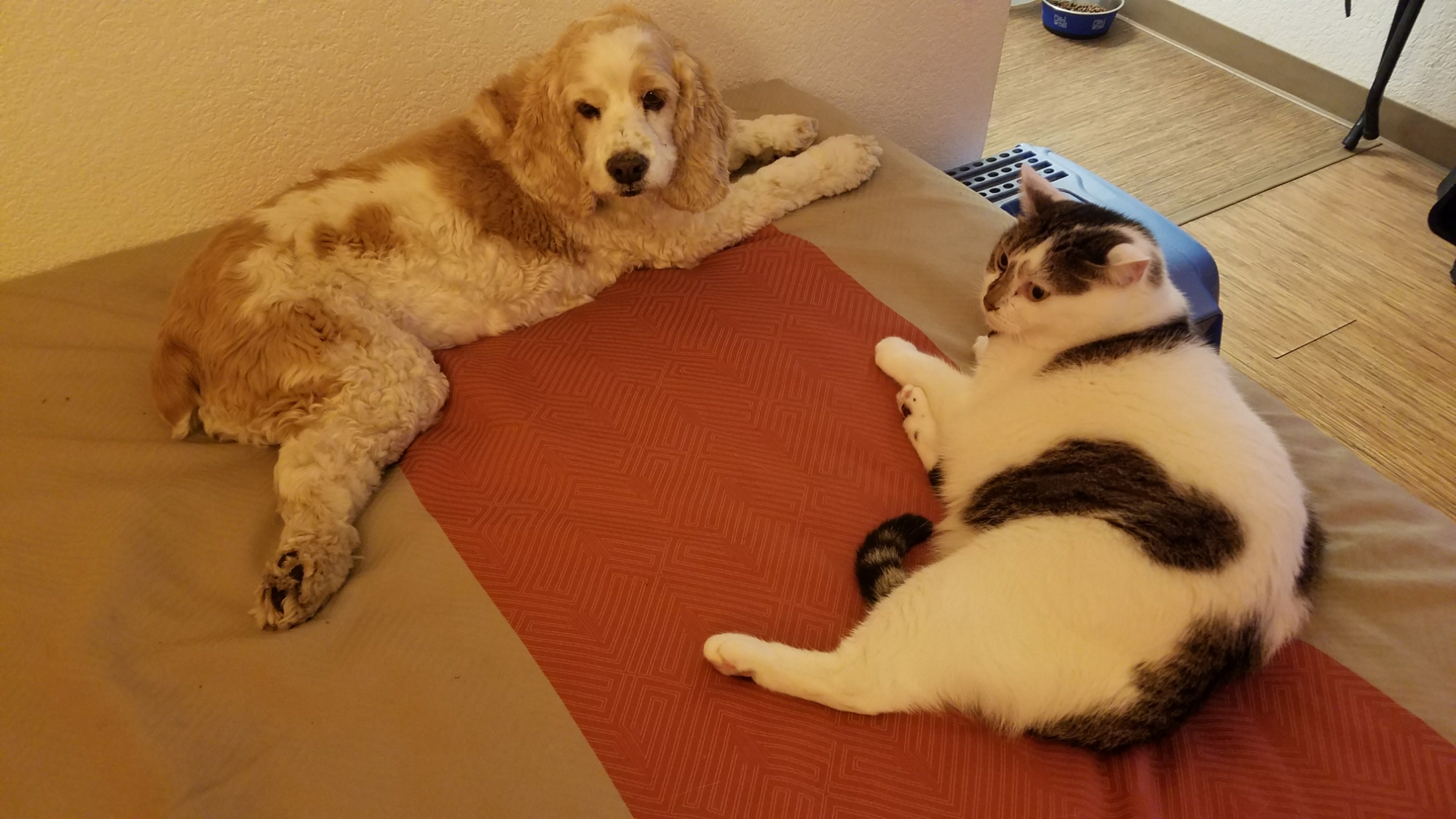 Well, Kip went to work and built us a condominium. It was up off the cold floor, and it was complete with a king cat bed and bowls of cat food and water. I heard him tell Miss Mary that he wouldn’t bring us inside. She said, “I should hope not! We already have six dogs in here.”