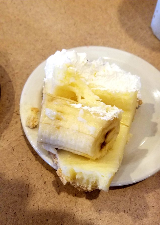 I vowed to make plum pudding with hard sauce the next time. Or I could give him something like this pie I got at an all you can eat cafeteria. The banana was hidden under the filling when I picked it out.