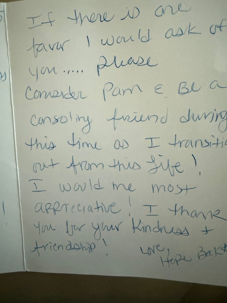 This was the bizarre part…I had just gotten a letter from Pam’s mother three days after she had died. A caregiver had written it for 98 year old Hope and it was asking me to please console Pam since Hope knew she was going soon to “meet our Lord and savior”the letter said. It was written in graceful flowing cursive in blue ink.